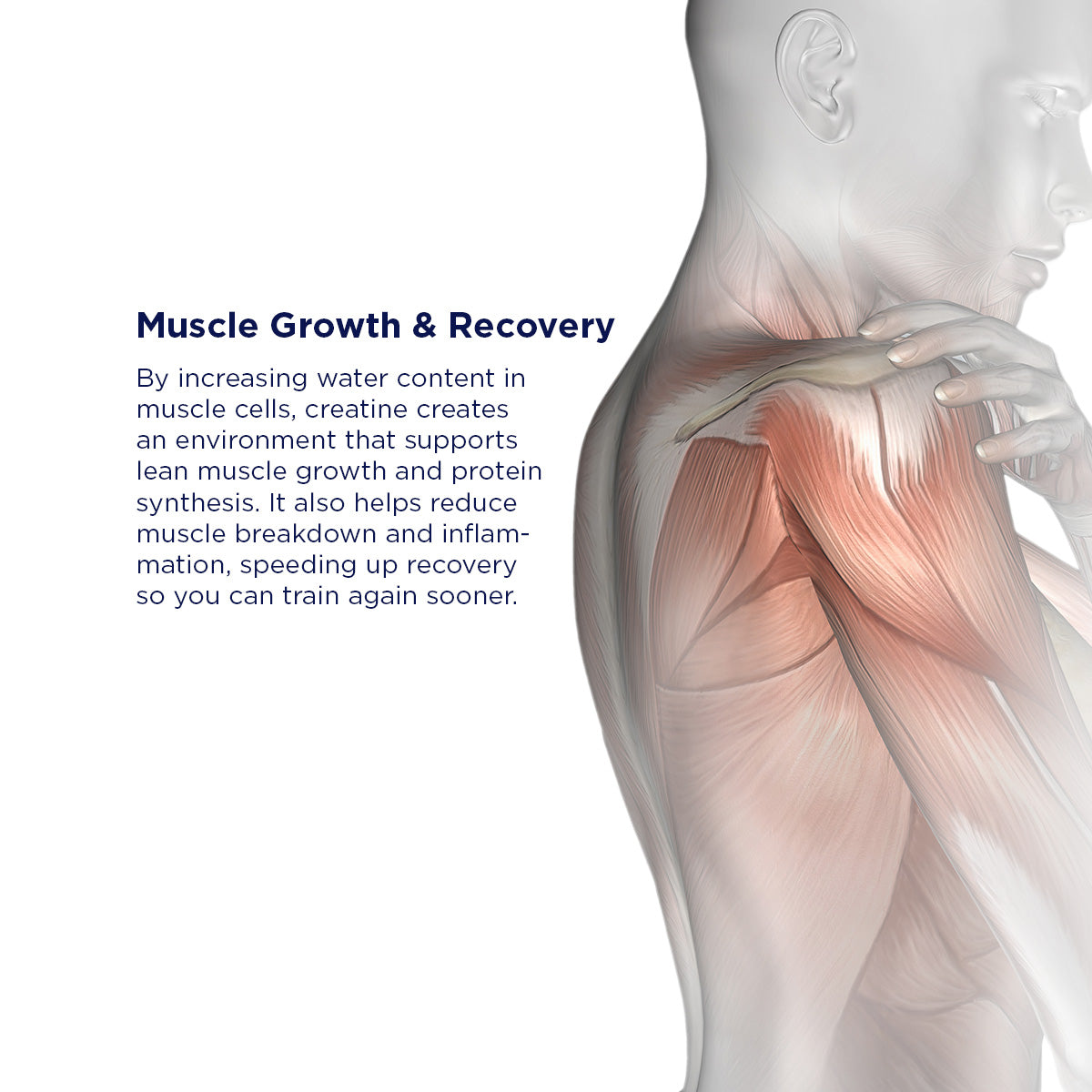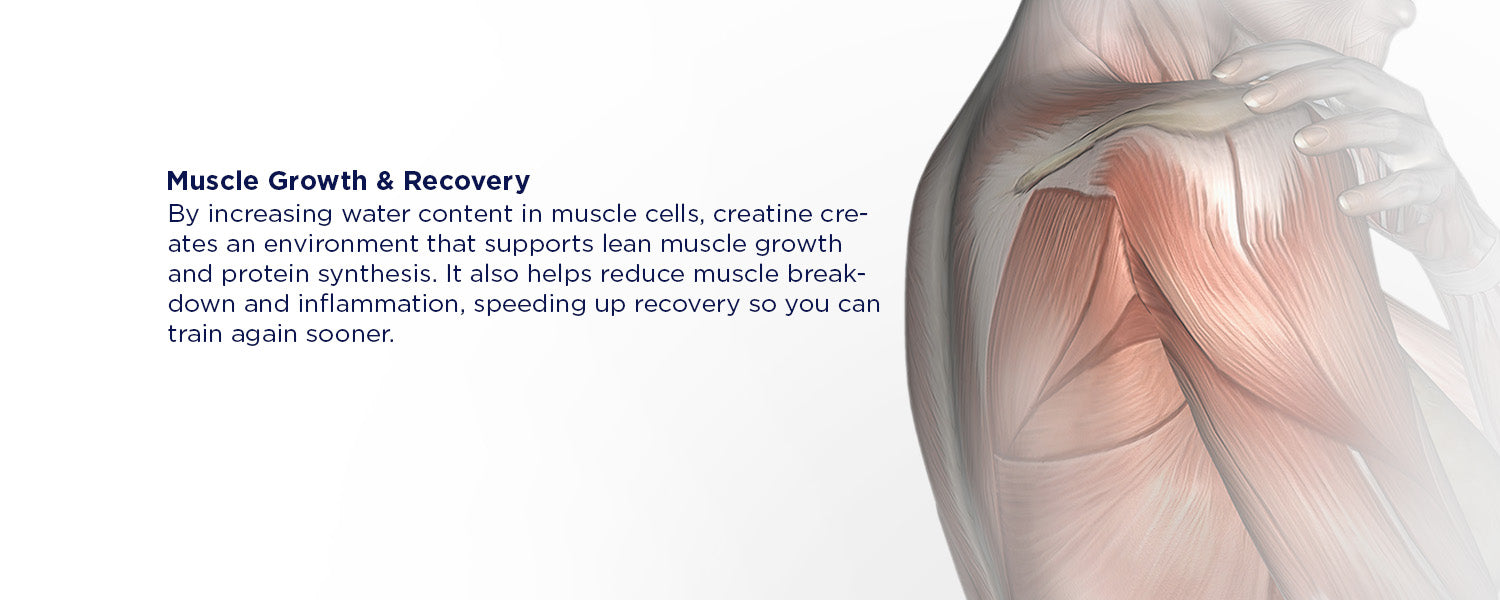 Creatine supports muscle growth by increasing water content in muscle cells, which promotes protein synthesis and muscle repair. It also reduces muscle damage and inflammation, helping you recover faster and build lean muscle more effectively.