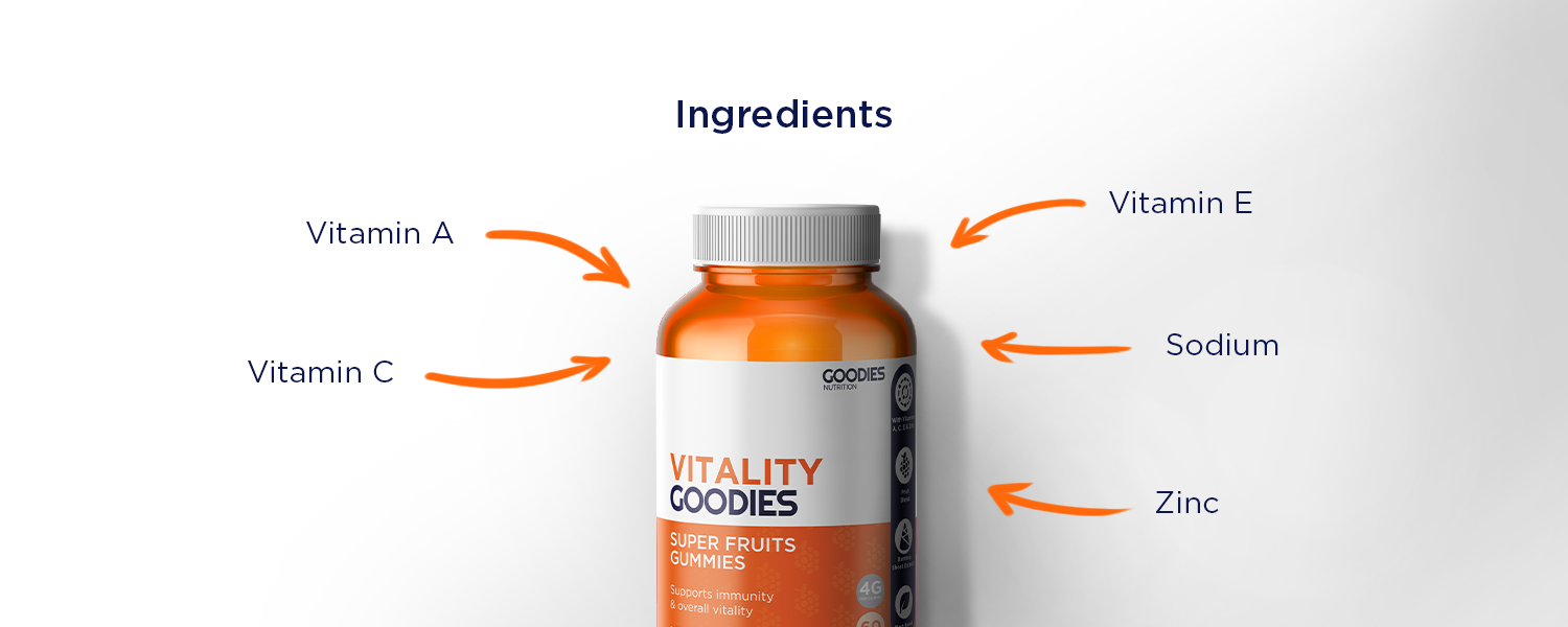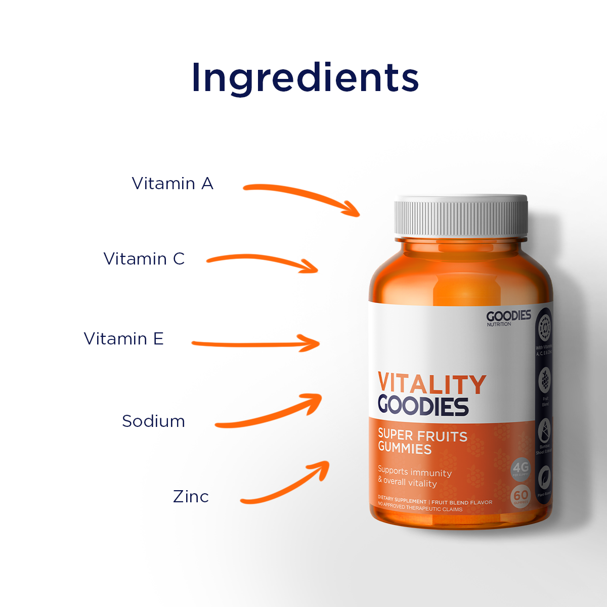 Our Vitality Goodies is a combination of vitamins and minerals to help your body get the nutrients that it needs to stay healthy and strong.