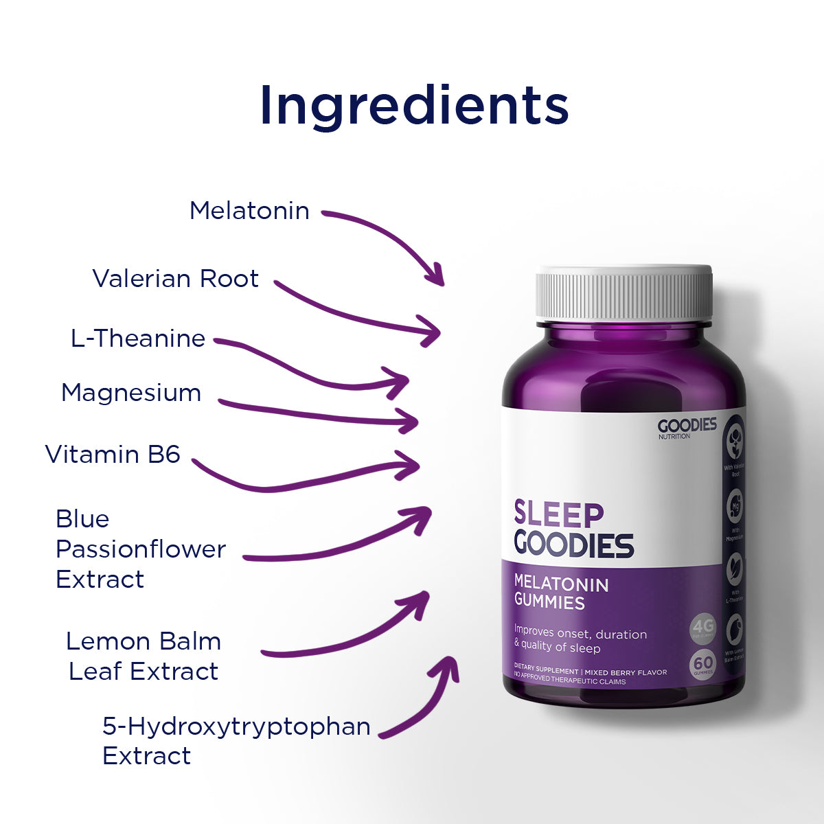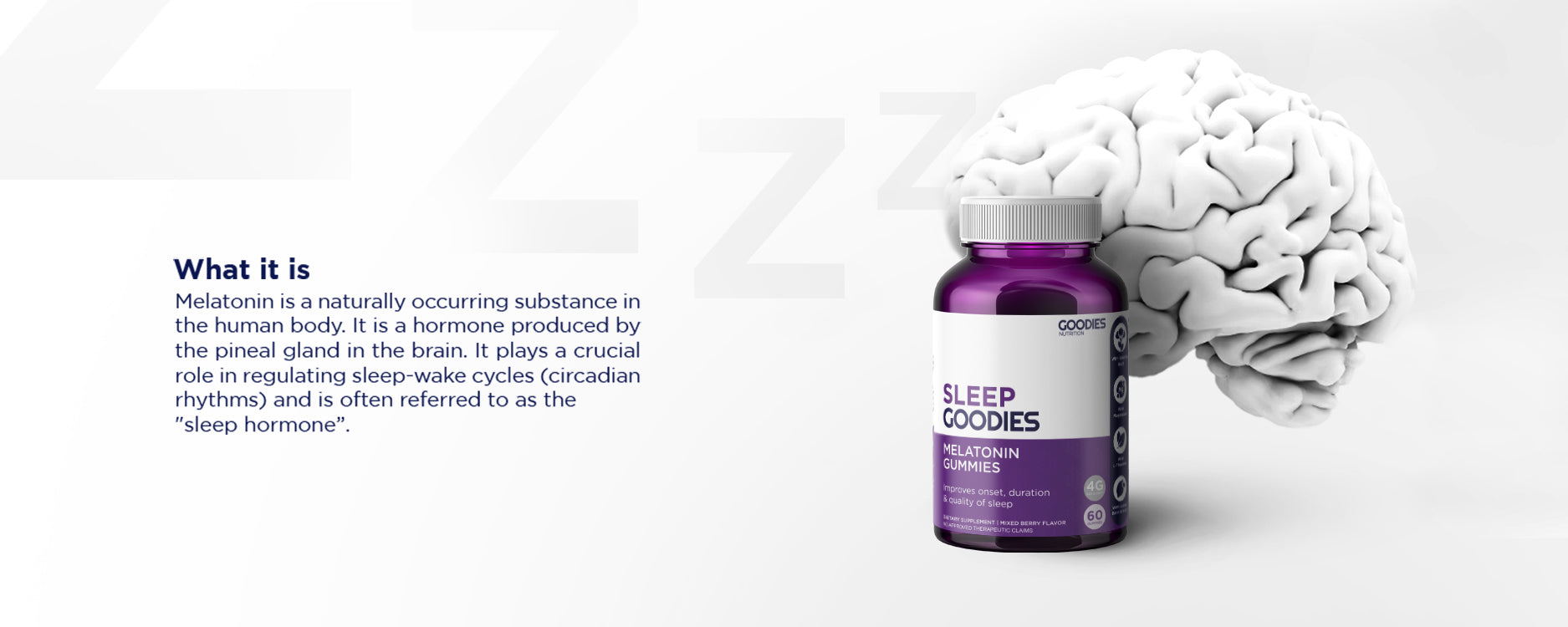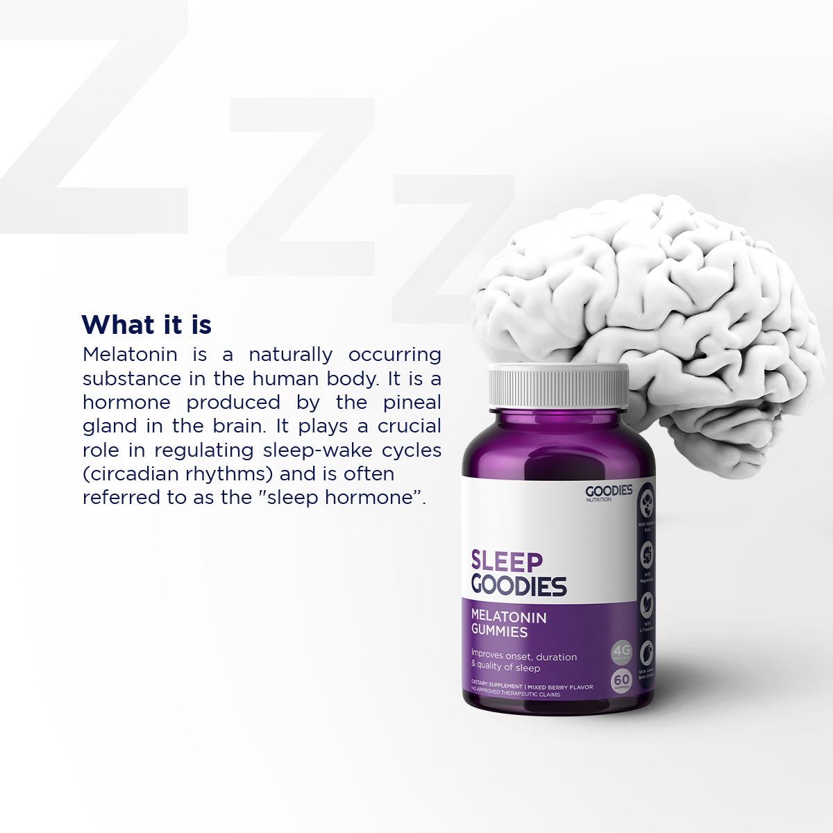 Our Sleep Goodies contain melatonin, to further support its natural production in our body. By doing this, you will be able to fall asleep faster and achieve deeper sleep.